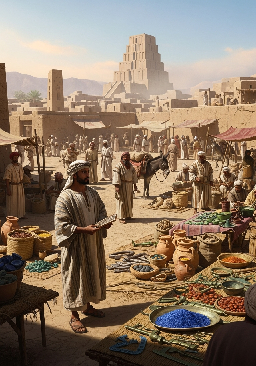 The moment they passed through the gate, the sound hit them. It was not the familiar murmur of the Susa market; it was a roar, a physical force composed of a thousand voices shouting in a dozen dialects of Akkadian and the strange, clipped sounds of Sumerian. The air, thick with the smells of roasting meat, pungent spices, and the sweat of a thousand bodies, was a meal in itself.