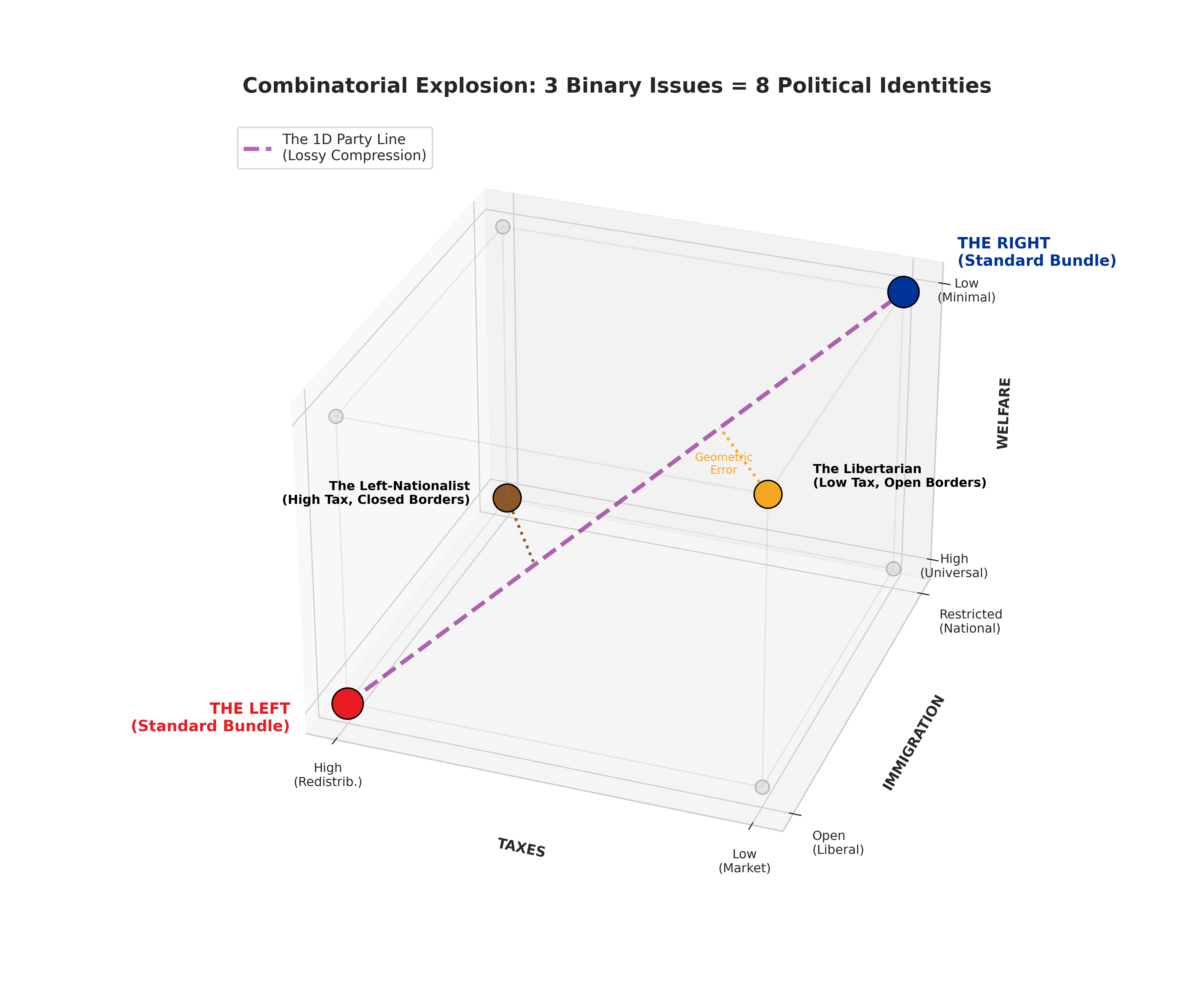 Critics might argue that real-world preferences are correlated—that ‘Left’ and ‘Right’ bundles naturally exist, and thus we only need to represent those specific corners of the hypercube. But this possibly confuses cause and effect, and ignores the fundamental measure of information: Entropy.